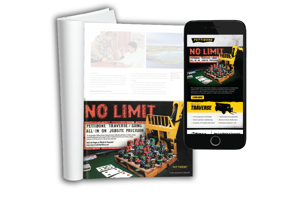 As World of Concrete neared, Pettibone had a cost-effective opportunity to advertise in Delta Sky magazine. We created a poker-themed ad headlined “No Limit” to tease the upcoming Vegas launch. The look of the ad was carried forward into various pre-show digital advertising placements, along with a “mobile campaign” targeted via Google on the Las Vegas Convention Center and the surrounding areas for the duration of the trade show.