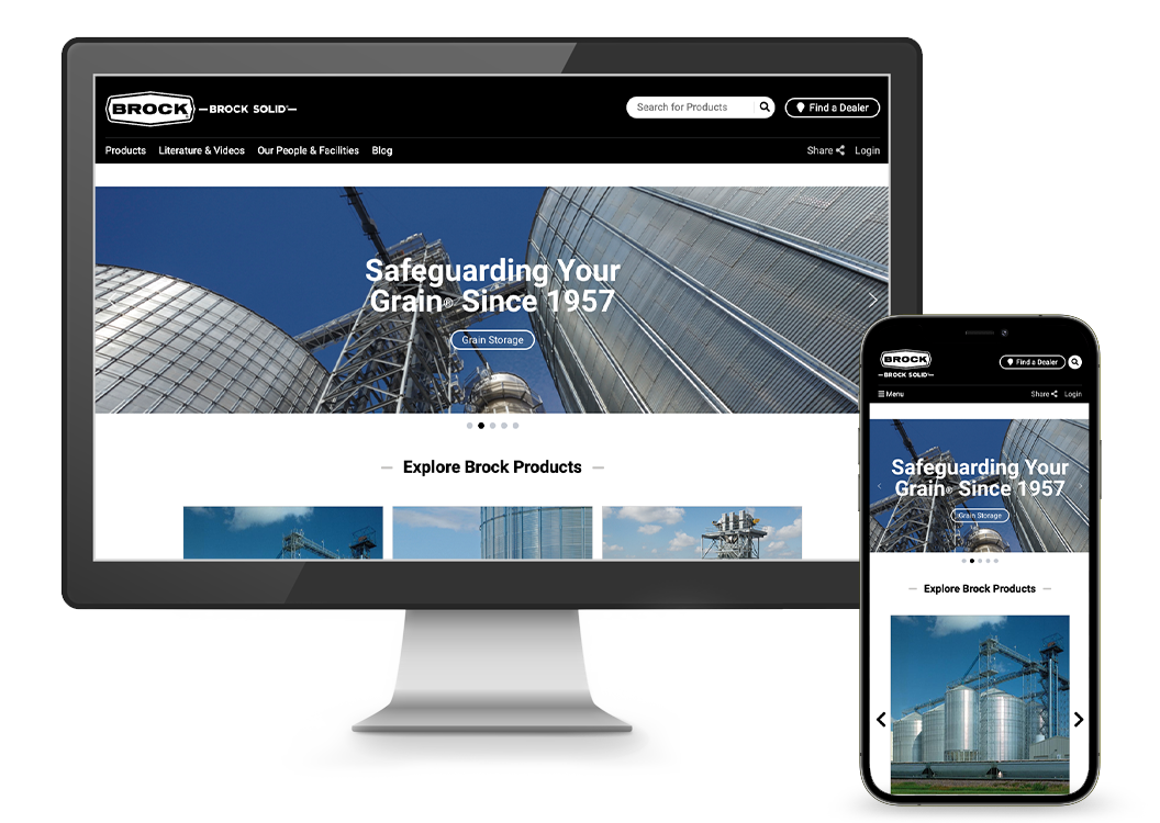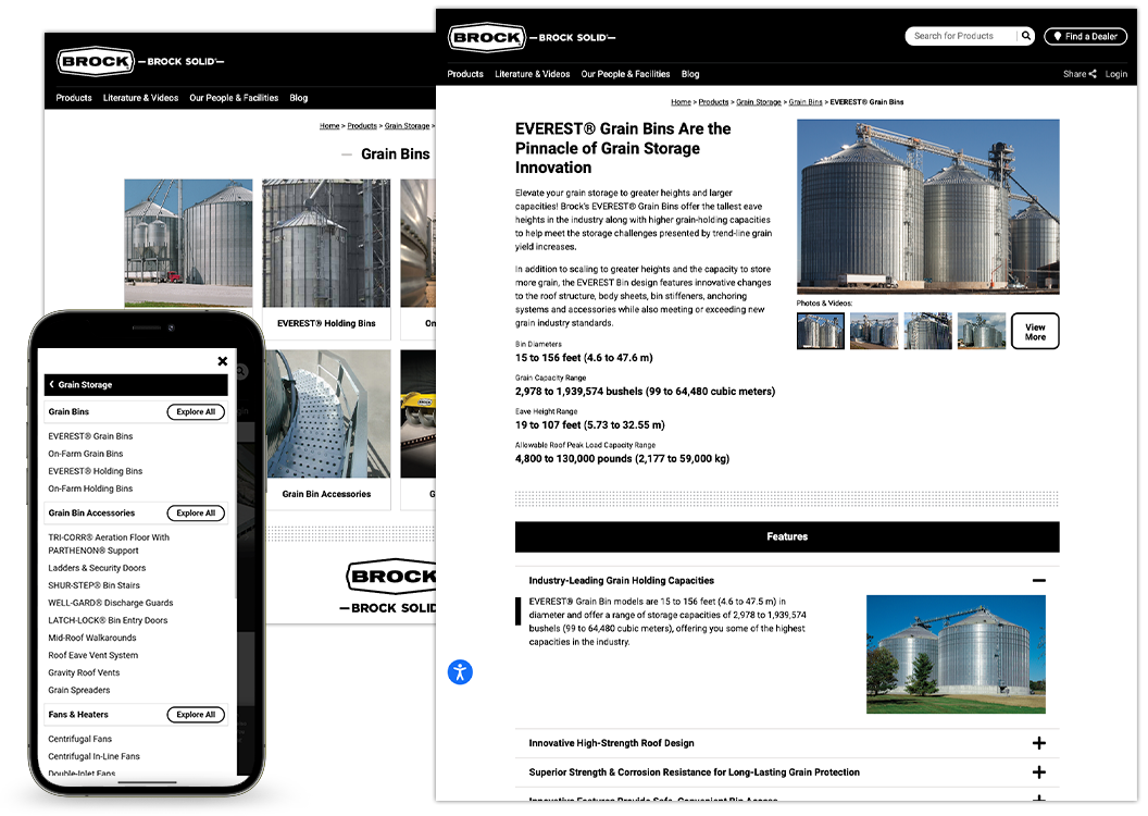 Brock Grain Systems is one of the most trusted names in grain storage and handling, known across the agriculture industry for durable equipment and dependable performance. Despite that reputation, however, Brock’s previous website didn’t reflect the strength of their brand or the full breadth of their product offering. Navigation was difficult, product details were limited, and the dealer locator lacked the functionality that customers expected.