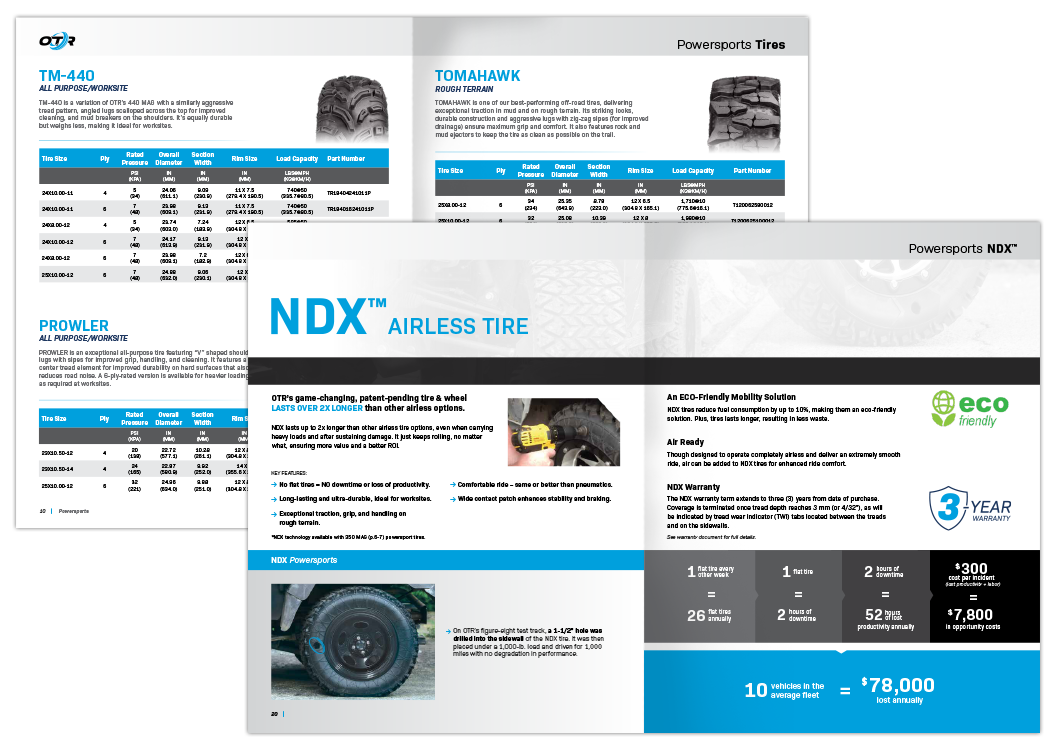 OTR serves multiple industries with engineered wheel, tire and assembly solutions, but their printed catalogs didn’t reflect the unified brand identity the company had invested in across their digital platforms and trade show presence. Each industry had its own catalog with visual styles and formatting that lacked consistency. OTR needed a refreshed, cohesive literature design to meet their updated brand standards.